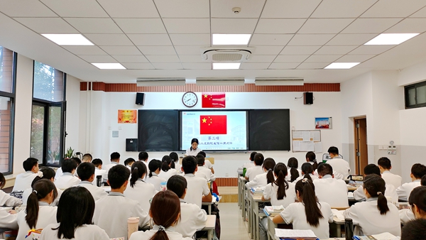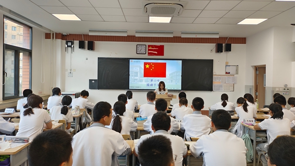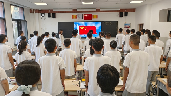 隨著國歌奏響,師生紛紛挺胸抬頭、筆直站立,牢牢注視著屏幕里緩緩升起的五星紅旗,目光堅定有神,共唱國歌。