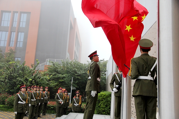 國旗隊步伐鏗鏘、意氣風(fēng)發(fā),護衛(wèi)國旗莊嚴(yán)入場。在雄壯的國歌聲中,全體師生肅立齊唱,注視著五星紅旗冉冉升起,迎風(fēng)飄揚于校園上空。