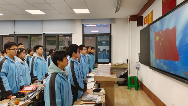 伴隨著雄壯的國(guó)歌聲,師生們昂首挺胸、肅然佇立,目光堅(jiān)毅地凝視著冉冉升起的五星紅旗,嘹亮的歌聲回蕩在校園。
