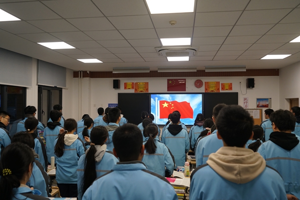 國歌奏響,五星紅旗冉冉升起,迎風飄揚。全體師生肅立注目,齊聲高唱國歌,場面莊嚴肅穆。