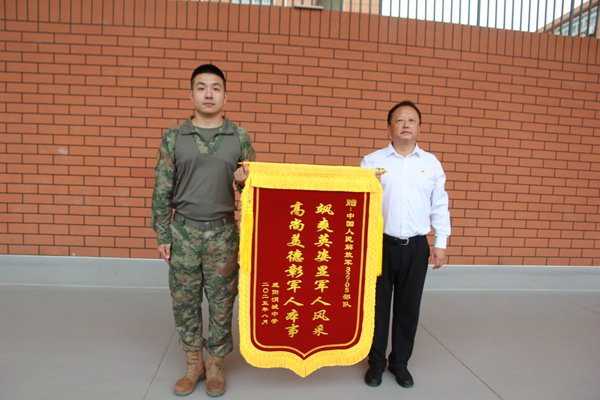 校長王璐代表學校向承訓部隊贈送錦旗,致謝部隊的支持和對學生的教導。
