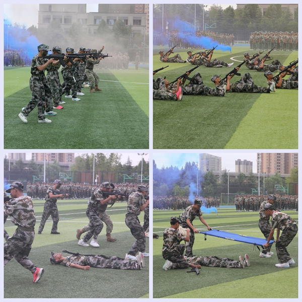 大會在莊嚴的國歌聲中拉開帷幕。當軍訓教官請示,全體軍訓學生準備就緒,等待檢閱時,臺上的軍官指示“開始!”2025級新生軍訓成果匯報表演正式開始。同學們以整齊的隊列、飽滿的精神、規范的動作,嘹亮的歌聲和喊聲,痛快淋漓地展現出七天軍訓帶來的蛻變,贏得全場陣陣掌聲。無論是集體歌唱時的慷慨激昂,還是軍體拳整齊劃一的動作,亦或學生隊列表演時的神情專注,激情活躍。持槍的學生和教官共同表演勇斗歹徒的訓練有素,氛圍濃烈,情節跌宕起伏,無不讓在場的老師和家長感到震撼。
