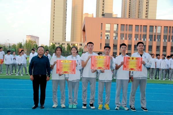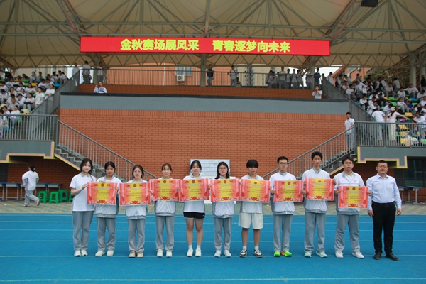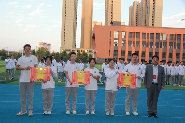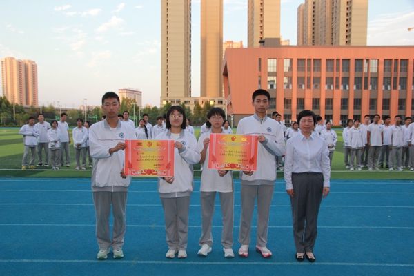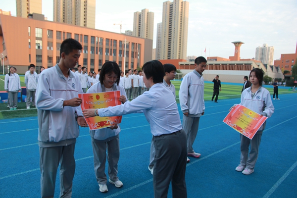 頒獎儀式上,校長王璐、副校長朱建光、副校長蘇艷、工會主席梁康分別為獲得“最佳通訊獎”“優秀組織獎”“精神文明獎”“班級風采展示獎”的集體頒獎,同時為團體一、二、三等獎班級頒發獎狀。全場師生向所有取得優異成績的班級與個人表示祝賀。