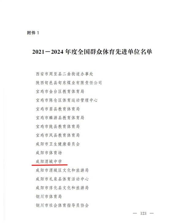 喜報||熱烈祝賀咸陽渭城中學榮獲“2021-2024年度全國群眾體育先進單位”榮譽稱號