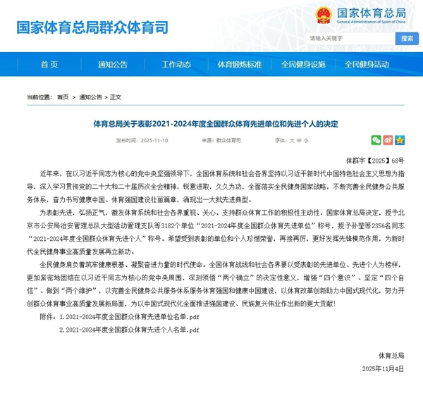 據2025年11月4日國家體育總局群眾體育司官網公示信息,國家體育總局發布《關于表彰2021-2024年度全國群眾體育先進單位和先進個人的決定》,我校憑借在群眾體育領域的扎實實踐與突出成效,被正式授予“2021-2024年度全國群眾體育先進單位”榮譽稱號。此項殊榮是國家體育總局對我校深耕群眾體育實踐、積極賦能全民健身事業發展的高度認可與權威褒獎。
