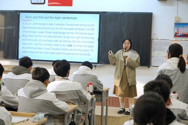 學校領導高度重視本次活動并全程參與觀摩,英語教研組全體教師積極投身聽評課環節。徒弟王振華老師首先執教。她以“地震”主題為線索,創設情境化閱讀任務,引導學生梳理文本敘事結構,并在教學過程中有機融入詞匯與句型的鞏固訓練。課堂氛圍生動活躍,充分體現了青年教師的教學創新意識與課堂設計能力。