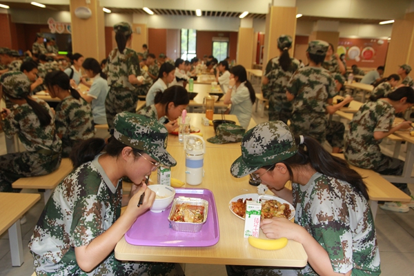 當(dāng)然,校園生活也少不了食堂。每次進(jìn)入食堂都令人興奮,因?yàn)檫@里的飯菜種類豐富,色香味俱全。每次打菜時(shí),阿姨都非常熱情,擔(dān)心我們吃不飽,菜量給得非常足。此外,飯后也不用我們洗碗,讓我們能安心軍訓(xùn)。無論是大晴天還是小雨天,我們都義無反顧地在操場(chǎng)軍訓(xùn)。晚上回到宿舍,可以在浴室洗澡,洗去一天的疲憊,令我感到一身清爽,以更加積極的精神狀態(tài)參加次日的訓(xùn)練。
